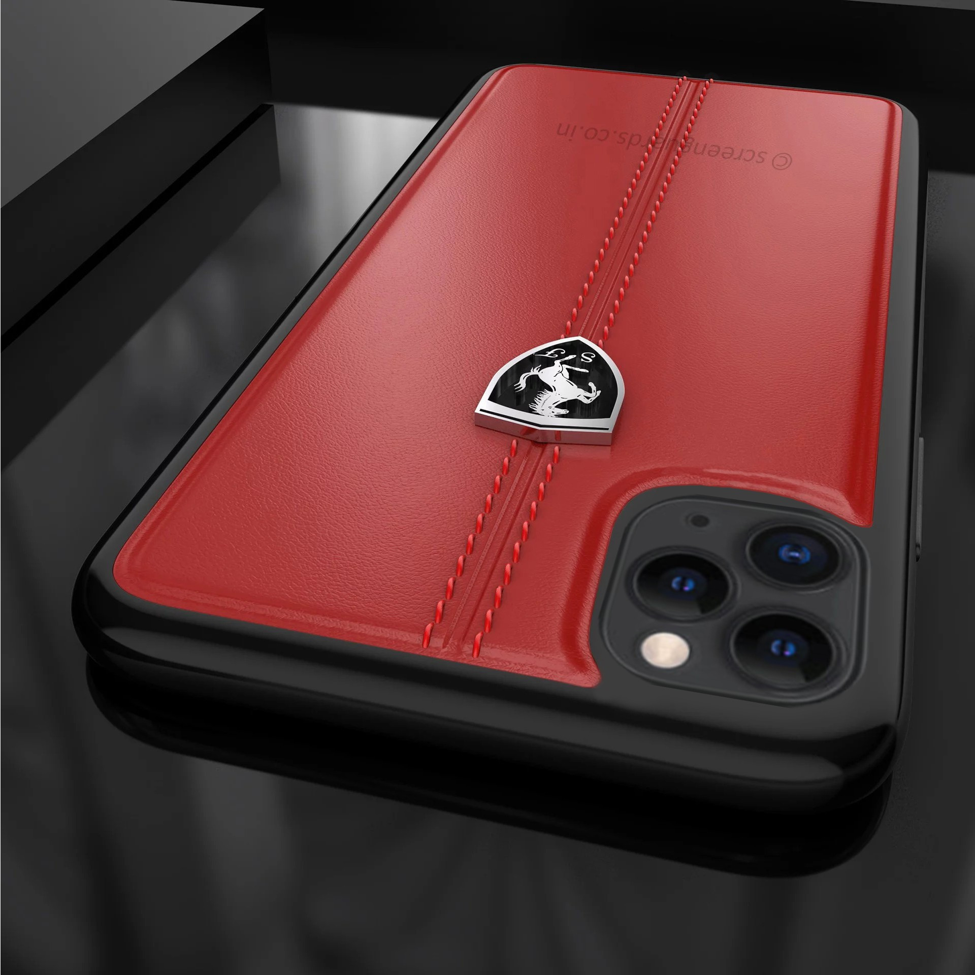 Ferrari Rigid red leather case for iPhone 11 Pro Max .... This new genuine leather case for iPhone 11 Pro Max echoes the modern yet elegant interior of Ferrari's legendary cars, embellished with a distinctive metal Ferrari Shield. Exuding a bold allure in vibrant red, this rigid case is distinguished by geometric tone-on-tone top-stitching and a racing-inspired hammered leather texture.